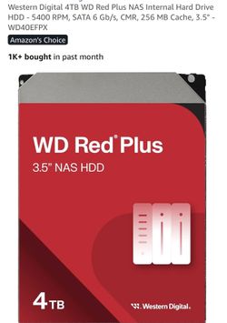 Western Digital 4TB WD Red Plus NAS Internal Hard Drive HDD - 5400 RPM, SATA 6 Gb/s, CMR, 256 MB Cache, 3.5" - WD40EFPX$70Phoenix, AZ