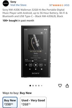 Sony NW-A306 Walkman 32GB Hi-Res Portable Digital Music Player with Android, up to 36 Hour Battery, Wi-Fi & Bluetooth and USB Type-C – Black NW-A306/B$280Phoenix, AZ