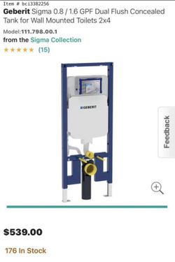 Geberit Sigma 0.8 / 1.6 GPF Dual Flush Concealed Tank for Wall Mounted Toilets 2×4$200Park Ridge, IL