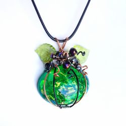 Sparkly green pumpkin copper black wire wrapped cabochon necklace with purple beads new handmade $18Princeton, WV