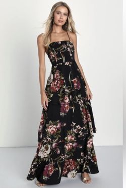 Lulus Enchanting Blossom Black Floral Satin Lace-up Tiered Maxi Dress Size M$40Kirkland, WA