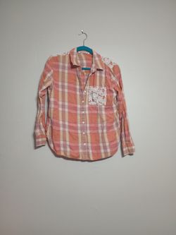 Pink, Peach, Salmon, Plaid Shirt With Lace Details, Hippy LAUNDRY SIZE L$20Pinellas Park, FL