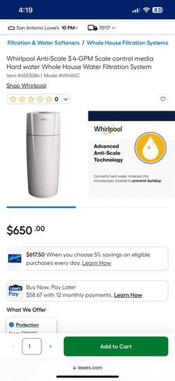 Whirlpool Anti-Scale Hard water Whole House Water Filtration System$450San Antonio, TX