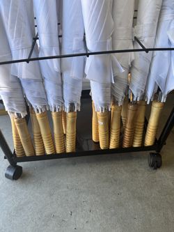 Large set 19 white, long handle UMBRELLAS. For event planner, offices. 40” wide with rolling cart.$65Brea, CA