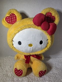 Sanrio Hello Kitty Yellow Teddy Bear Suit Costume Hearts Print 14” Plush NEW$20Oak Forest, IL