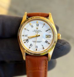 1981 Rolex Oyster Perpetual Date 15037 14k yellow gold 34mm light brown leather band factory skinny white Roman dial yellow gold fluted bezel watch bo$6,500Boca Raton, FL