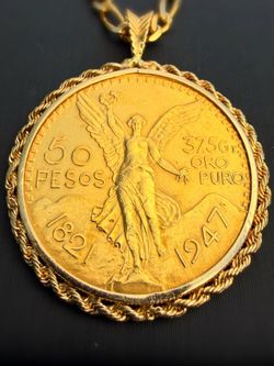 1947 Mexico 50 Peso gold Coin bullion in 14k rope bezel pendant & 14k solid yellow gold Figaro chain 28” 4mm necklace$11,500Boca Raton, FL