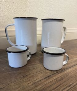 2 Large coffee cups mugs and 2 espresso cups. Tin and enamel white and black. Camping/beach. $20Encinitas, CA