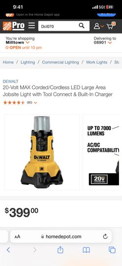 Dewalt 20-Volt MAX Corded/Cordless LED Large Area Jobsite Light with Tool Connect & Built-In Charger$300New Brunswick, NJ