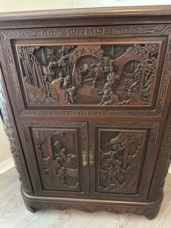 George Zee Mid Century Asian Carved Teak Dry Bar Cabinet$500Port St. Lucie, FL
