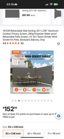 VEVOR Retractable Side Awning, 63''x 236'' Aluminum Outdoor Privacy Screen, 280g Polyester Water-proof Retractable Patio Screen, UV 30+ Room Divider W$80Upland, CA