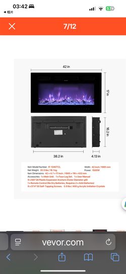 VEVOR 42 inch Electric Fireplace, Wall Mounted Recessed Fire Place with Remote Control, Timer, 1500W, Adjustable Flame Color Brightness, Touch Screen,$80Upland, CA