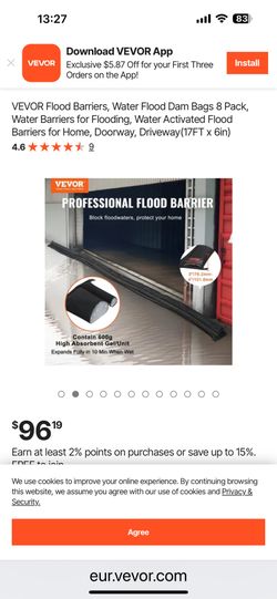 VEVOR Flood Barriers, Water Flood Dam Bags 8 Pack, Water Barriers for Flooding, Water Activated Flood Barriers for Home, Doorway, Driveway(17FT x 6in)$45Upland, CA