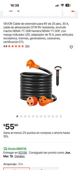 VEVOR Cable de extensión para RV de 25 pies, 30 A, cable de alimentación STW RV resistente, enchufe macho NEMA TT-30R hembra NEMA TT-30P, con mango in$30Montclair, CA
