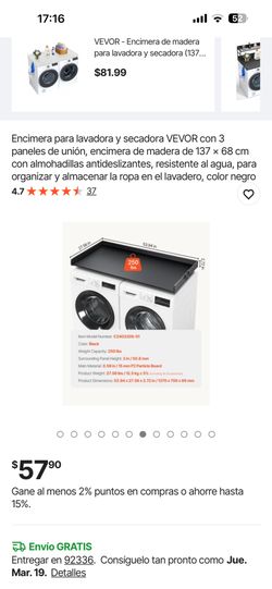 Encimera para lavadora y secadora VEVOR con 3 paneles de unión, encimera de madera de 137 x 68 cm con almohadillas antideslizantes, resistente al agua$25Montclair, CA