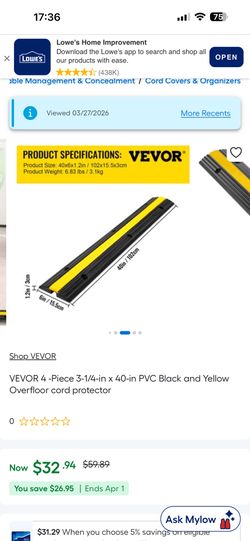 VEVOR 4 -Piece 3-1/4-in × 40-in PVC Black and Yellow Overfloor cord protector$18Montclair, CA
