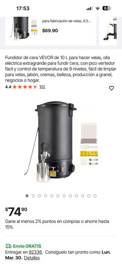Fundidor de cera VEVOR de 10 L para hacer velas, olla eléctrica extragrande para fundir cera, con pico vertedor fácil y control de temperatura de 9 ni$38Montclair, CA