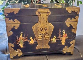 Vintage Asian Jewelry Box Mother of Pearl Geishas Black Lacquer Wood & Brass$250Tampa, FL