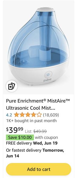 Pure Enrichment® MistAire⢠Ultrasonic Cool Mist Humidifier - Quiet Air Humidifier for Bedroom, Nursery, Office, & Indoor Plants - Lasts Up To 25 Hours$20Aliso Viejo, CA