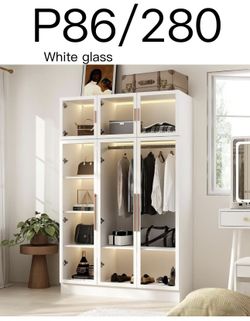 P86ðWardrobe Cabinet with LED Lights, Armoire Closet with Glass Doors, Wooden Large Wardrobe with Hanging Rod & 5 Tiers Shelf, Modern Bedroom Armoire$280Columbia, MD