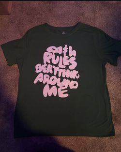 Dark green short-sleeve graphic T-shirt with bold white bubble lettering that reads “Cash Rules Everything Around Me.” Classic crew neckline, relaxed $18Dunn, NC