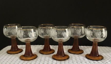 Set of 6 Vintage Luminarc France Roemer Wine Glasses - Amber Beehive Stem - Gold Rim - Etched Grapes$60Carrollton, TX