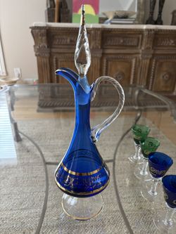 Hand Blown Italy Art Glass Ewer Pitcher w 5 Cordial Glasses Gilt 1950s Vintage$60Portland, OR