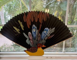 Antique Chinese Paper Hand Fan Handpainted Wood Duck 26" Wide Oriental$20Key Largo, Florida