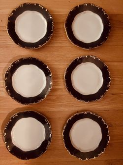 Zsolnay Pompadour III dessert plates. They feature a cobalt blue rim adorned with intricate gold scrolling and a white center$210Dallas, TX