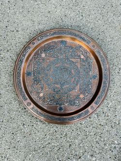 VINTAGE MIDDLE EASTERN PERSIAN ISLAMIC HAND CHASED SILVER INLAY COPPER PLATE$55Niles, IL
