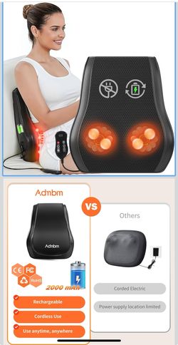 Back Power source Battery Powered Brand Admbm Colour Black Massager Form Massage Pillow Is it cordless? Yes COMPLETELY UPGRADED RECHARGEABLE MASSAGER:$78City Of Industry, CA