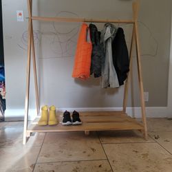 Montessori-style wooden clothing rack with built-in shoe shelf.