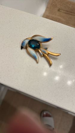 This is a vintage Coro Pegasus "jelly belly" bird brooch featuring blue and white enamel details with a blue glass cabochon stone for the body$80Murrieta, CA