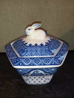 Bombay Company blue and white hexagonal porcelain box rabbit bunny$45Wittmann, AZ
