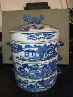 RARE Chinese Dragon Blue Willow 3 Stacking Tiffin Lunch Box Covered Dish$150Wittmann, AZ
