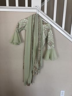 3 piece, synthetic mixed fabric, embroidered light green plazzo suit, age 10. Good condition. Kameez with full embroidery on front of suit.$40San Jose, CA
