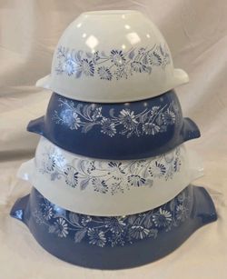 Vintage pyrex blue white colonial mist set four mixing nesting bowl bowls$200Ramona, CA