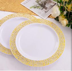 100pcs Gold Plastic Plates, 10.25" White Plastic Dinner Plate, $35Garland, TX