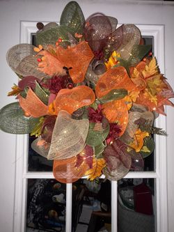 Handmade Fall Deco Mesh Wreath with Lights – Autumn Harvest Leaves, Pumpkins & Sunflowers – 22” Front Door Decor$40Tomball, TX