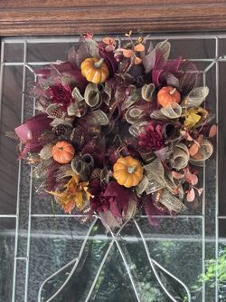 Handmade Fall Deco Mesh Wreath with Pumpkins & Burgundy Ribbon – Autumn Door Décor Thanksgiving Accent$19Tomball, TX