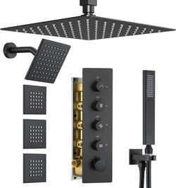 Matte Black Thermostatic Shower System with Body Jets, Ceiling 16” Rainfall Shower & Wall Mount 6-Inch Shower Head Luxury Shower Faucet Set with Handh$445Katy, TX