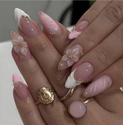 3D Pink Press on Nails Almond - Medium French Tip Fake Nails with Embossed Flower&Gold Bead Designs, Glossy Finish Reusable False Nails with Glue Tabs$20San Diego, CA