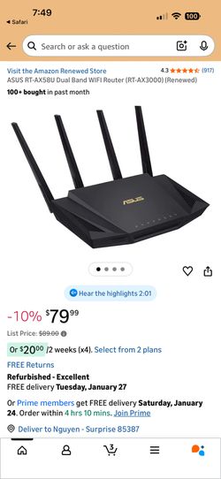 ASUS RT-AX58U Dual Band WIFI Router (RT-AX3000)$60Sun City, AZ
