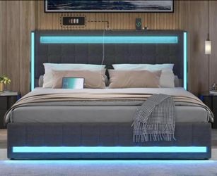 Queen Size Bed Frame with LED Lights and Charging Station, Upholstered Platform Bed with Adjustable Headboard, Queen Size Bed with Wooden Support and $120El Monte, CA