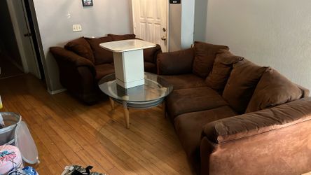 Brown Loveseat and Couch With Glass Table and an End Table For $100.00$100Moreno Valley, CA