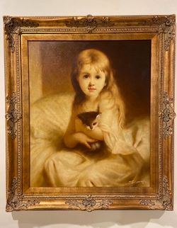 Beautiful 23x20 Framed Oil on Canvas Painting Girl Holding Kitty, $425, John Emms $425Great Nck Plz, NY