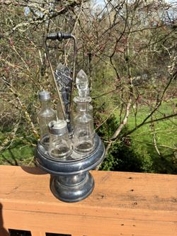 Victorian Silver Plated Etched Cruet Condiment Set Footed Caddy Reed Barton ** One of the stoppers exhibits a chip.**$50Portland, OR