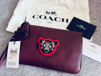 COACH BORDEAUX LEATHER BEAR RACCOON VARSITY PATCH TURNLOCK WRISTLET LIMITED $175Queens, NY