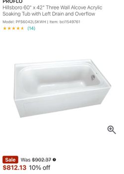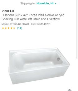 PROFLO Hillsboro 60" x 42" Three Wall Alcove Acrylic Soaking Tub with Left Drain and Overflow$500Wilmington, CA