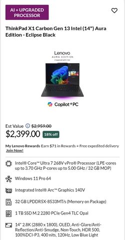 Lenovo ThinkPad X1 Carbon Gen 13 Aura 14” OLED ULTRA 7 268V vPro 32GB 1TB 4Y$1,850Miramar, FL